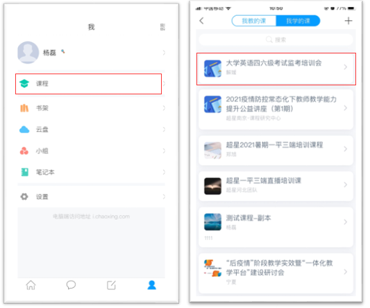 ④进入首页后,点击右下角“我”,找到“课程”-“我学的课”-“大学英语四六级考试监考培训会”-“章节”-“监考培训”,即可开始学习。