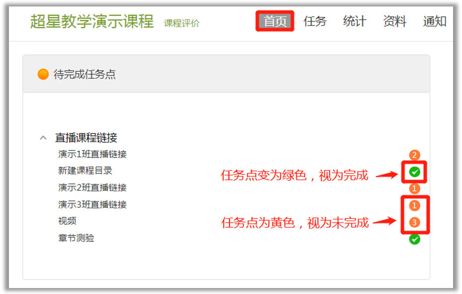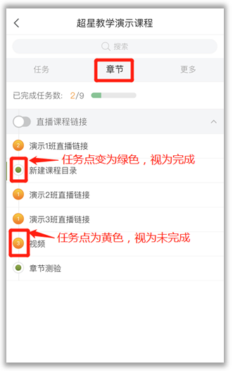 ⑤学习章节任务点:进入课程,点击“章节”,进入对应的章节完成任务点学习。任务点变为绿色,视为该任务点完成。任务点为黄色,则视为未完成。