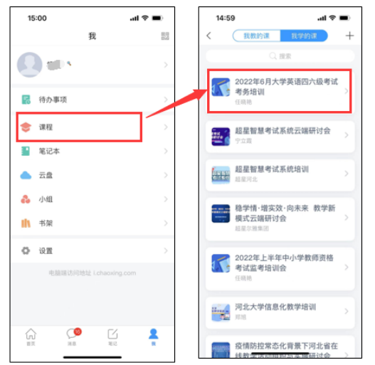 ④进入首页后,点击右下角“我”,找到“课程”-“我学的课”-“2022年6月大学英语四六级考试考务培训”-“章节”-“监考培训”,即可开始学习。