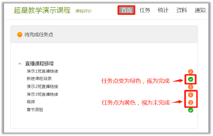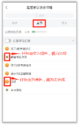 ⑤学习章节任务点:进入课程,点击“章节”,进入对应的章节完成任务点学习。任务点变为绿色,视为该任务点完成。任务点为黄色,则视为未完成。