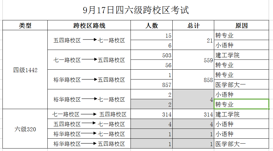 在9月17日将要举行的大学英语四六级考试中,因转专业、搬校区及小语种考试等原因,部分学生需跨校区参考,现为学生安排校车,请各学院安排专人护送学生乘车,具体安排如下:
