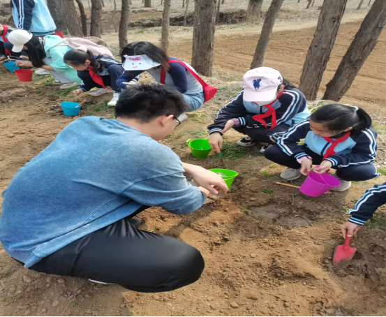 启动仪式结束后,教育学专业学生带领前卫路小学三至六年级学生开始实践活动。小学生们需要完成播种、耕地、磨豆浆、嫁接、做鸟巢、测量树高等任务,教育学专业学生主要负责组织并指导他们完成相应活动,现场氛围活跃热烈。