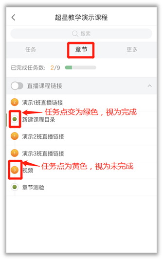 ⑤学习章节任务点:进入课程,点击“章节”,进入对应的章节完成任务点学习。任务点变为绿色,视为该任务点完成。任务点为黄色,则视为未完成。