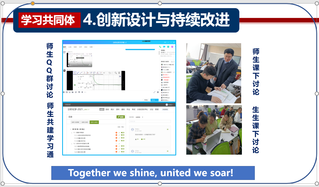 ——目标一:通过活动使学生学会管理自己,学会与人相处,学会集体生活,克服学习的瓶颈。建立课上和课下的“基于合作学习的学习共同体”。将化学家唐本忠院士提出的“Together we shine, united we soar(可直译为:我们紧紧团结在一起,就发出闪亮的光芒;我们手来手团结在一起,就会飞得更高)”聚集诱导发光的化学前沿理论,转化为课程思政内容,成为营造基于合作学习的学习共同体的理念,并进一步拓展形成了课程思政“八珍汤”:中国梦的故事、爱国报国故事、服务社会故事、前辈创业故事、探索创新故事、身边榜样故事、责任担当故事、安全预防故事。