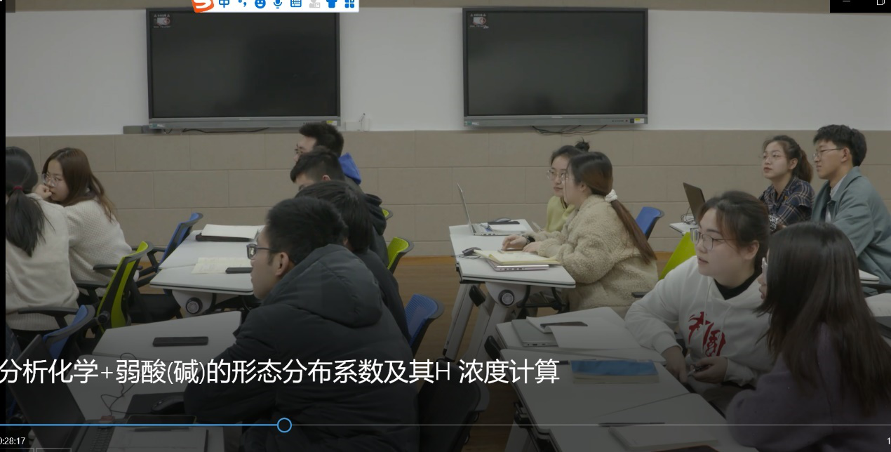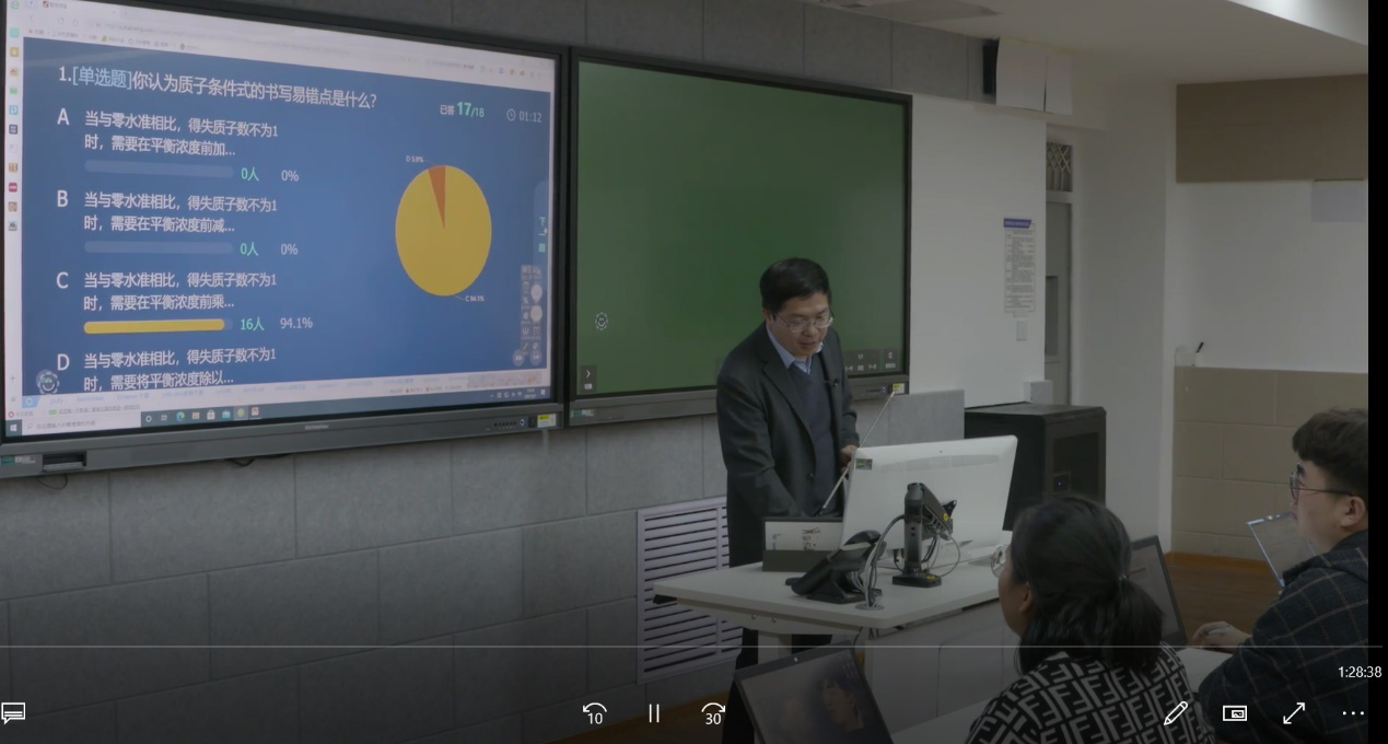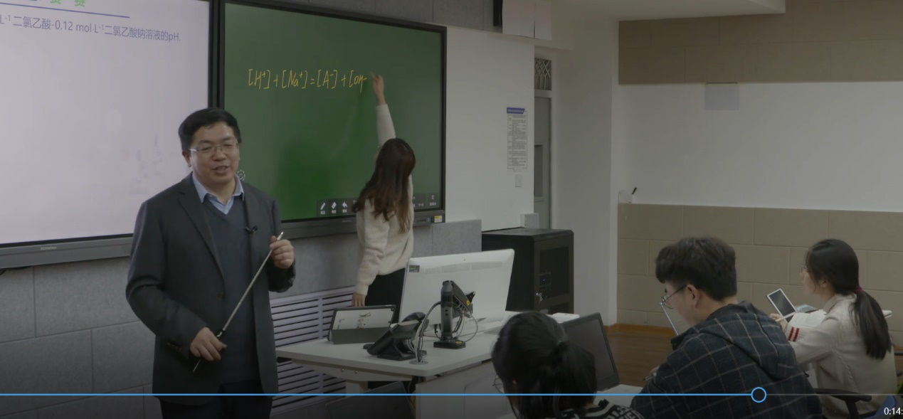 0:00-4:54教学活动1: 通过学习通对课前学习评价、学生作答、引入课程内容。 4:55-7:31教学活动2: 提出概念;学生聆听思考。 7:32-10:32 教学活动3: 探究影响因素;学生聆听思考。 10:24-11:21 教学活动4: 变量替换;学生聆听思考; 11:22-13:29 教学活动5: (1)呈现如何使用信息技术解决分析化学问题的总思路;学生聆听。 (2)提出了将中国化学家唐本忠院士提出的“Together we shine, united we soar”化学新思想,转化为学习共同体构建的理念,以促进相互讨论、分享观点、分享做法、黑板展示等积极的教学活动场景。 13:30-18:23 教学活动6: Geogebra软件作图介绍;学生聆听。 18:24-19:28教学活动7: 思考题,检查学生对形态分布曲线交点化学意义的理解;学生聆听,回答问题。 19:28-22:08 教学活动8: 思考题,检查学生可否描述形态分布规律;学生回答。 22:09-27:06 教学活动9: 贴近生活,通过春节档的热片情节,引出一种特殊酸,引出“化学+”App的使用,引申为化学职业道德。 进一步安排任务:查找HCN的毒性和物理化学性质,为下面的问题做好铺垫。学生回答问题。 27:07-31:05 教学活动10: 创设NaCN使用完毕的场景,将形态分布系数与环保意识联系起来。学生进行分析。 31:30-37:17 教学活动11: 融入学科前沿,分析化学分支的色谱技术,中国色谱从跟跑到领跑的发展以及色谱期刊,增强民族自豪感和中国学术自豪感。 讨论思考,反相液相色谱分离有机酸的流动相条件,拉近了前沿与基本概念学习间的距离,增加学习的成就感。介绍了抑制解离法的色谱原理基础就是形态分布系数。 37:18-44:16 教学活动12: 融入研究前沿。介绍分析化学期刊、毛细管电泳技术。 深入思考:萃取、反萃、有机碱,以检查学生灵活运用形态分布系数基本概念的能力。学生讨论并回答。 44:17-44:26 教学活动13: 由浅入深,学习二元酸的形态分布系数。强化学生的基本技能。 44:27-48:02 教学活动14: 共性寓于个性之中,教会学生思考问题的方法。 48:03-48:35 教学活动15: 布置下次课的“比一比”、“赛一赛”的基本功作业,作业与课堂讲授相比,有一定的挑战度。 49:36-49:36 教学活动16: 开始讲述第二部分,氢离子的计算,并提出学习要求。 49:37-52:54 教学活动17: (1)讲述国家科技创新的瞩目成就,激发学生的民族自豪感,唤起学生创新的意识。 (2)告诉学生,我们即将开启一趟创新之旅。因为它是我们自己提出的“强模型化、去公式化、融信息化、增可视化”分析化学新方法,我们的分析化学课上所独有! 激发学生学习这个方法的积极性。 52:55-57:03 教学活动18: 通过与传统方法求解氢离子浓度的过程相比较,提出了我们的最简单的途径:共三步。 57:04-1:06:41 教学活动19: 以一个例子,来引领大家一起去解题。有学生到黑板去解答。 1:06:41-1:08:12 教学活动20: 布置了课下“相互学”的作业。 1:09:13-1:15:08 教学活动21: 难度由一元酸变为二元弱酸,同学到黑板去解答。 1:15:09-1:22:10教学活动22: 难度由简单的酸变为缓冲溶液,学生到黑板去解答。提醒同学,电荷平衡由于质子条件式。 1:22:11-结束 教学活动23: 复杂体系中氢离子浓度计算,同学分享观点,如果学生没有写正确,帮助分析原因。布置另一个作业题。简要总结。 |